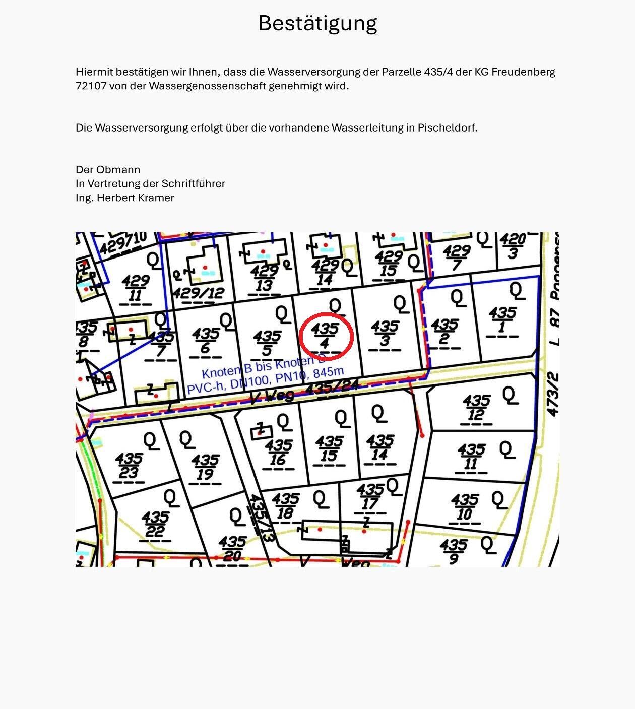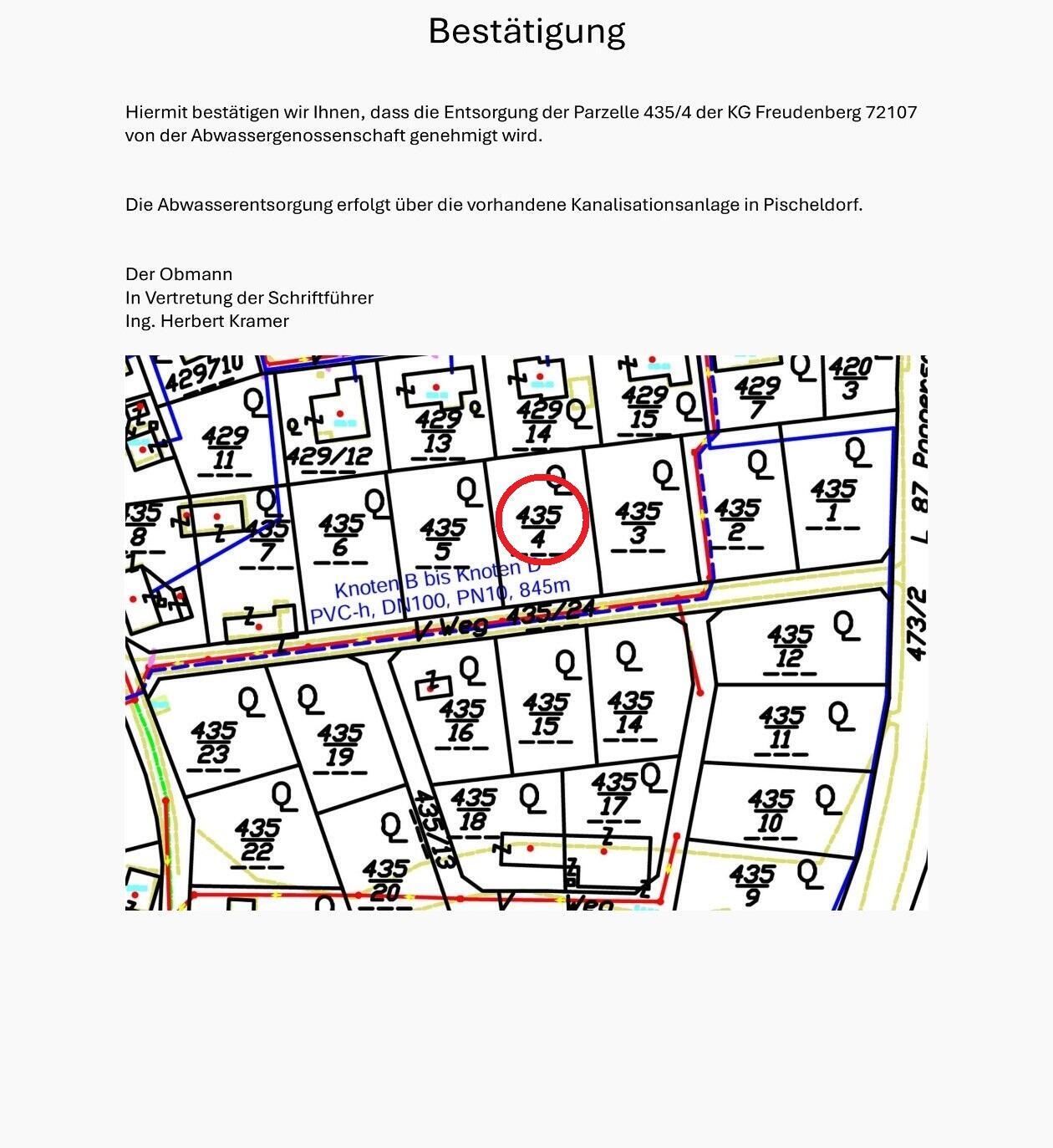Die Kanal- und Wasseranschlussmöglichkeiten für das Grundstück befinden sich in der öffentlichen Zufahrtstraße. Der Stromanschluss befindet sich an der Grundstücksgrenze.