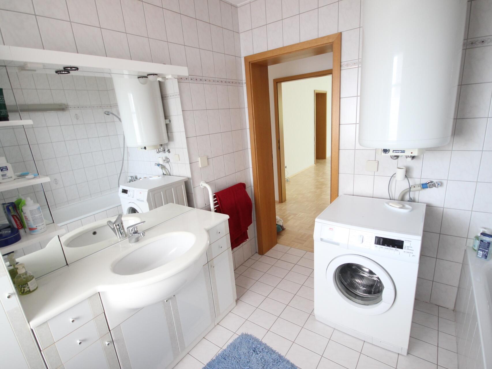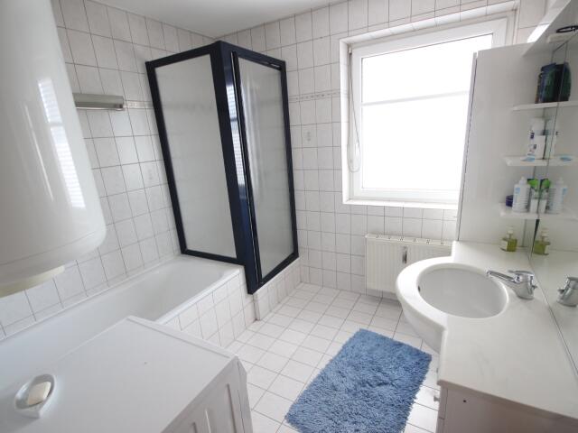 Bad mit Badewanne, Dusche, Waschmaschinenanschluß und Fenster.