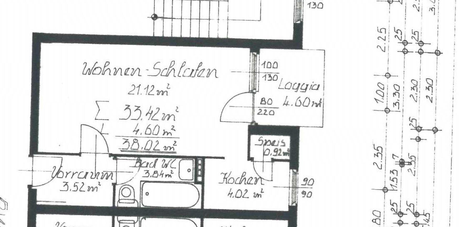 ...²), 1 großes Wohn-/Ess-/Schlafzimmer (21,12m²) plus schöner Ostloggia (4,60m²), 1 neue Küche (4,02m²) mit Speis (0,92m²), 1 Bad mit Badewanne und WC (3,84m²) und 1 Kellerabteil. Alle Flächenangaben lt. Plan und Nutzwertgutachten ohne Gewähr! Änderungen und Irrtümer sind vorbehalten!