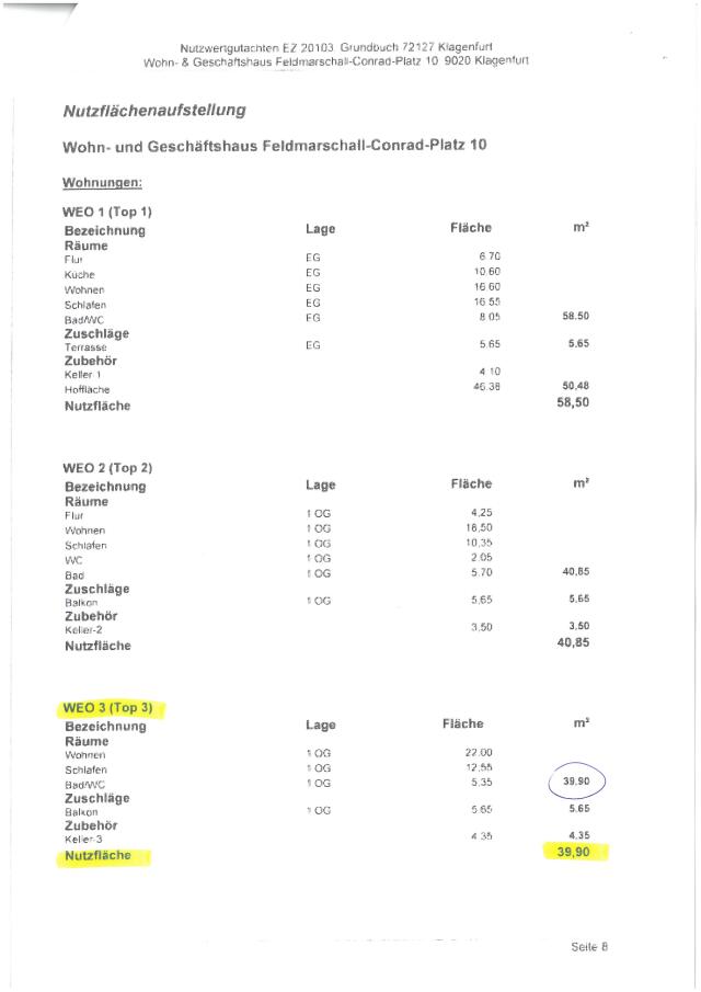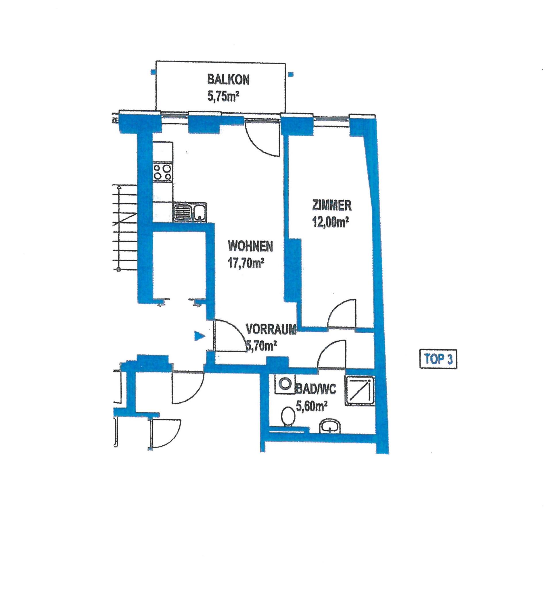 ...ele (5,70m²), 1 Wohn-/Esszimmer mit Küche (17,70m²) mit Westbalkon (5,75m²), 1 Schlafzimmer (12,00m²), 1 Bad mit Dusche und WC (5,60m²) und 1 kleines Kellerabteil. Alle Flächenangaben lt. Plan und Nutzwertgutachten und ohne Gewähr!
