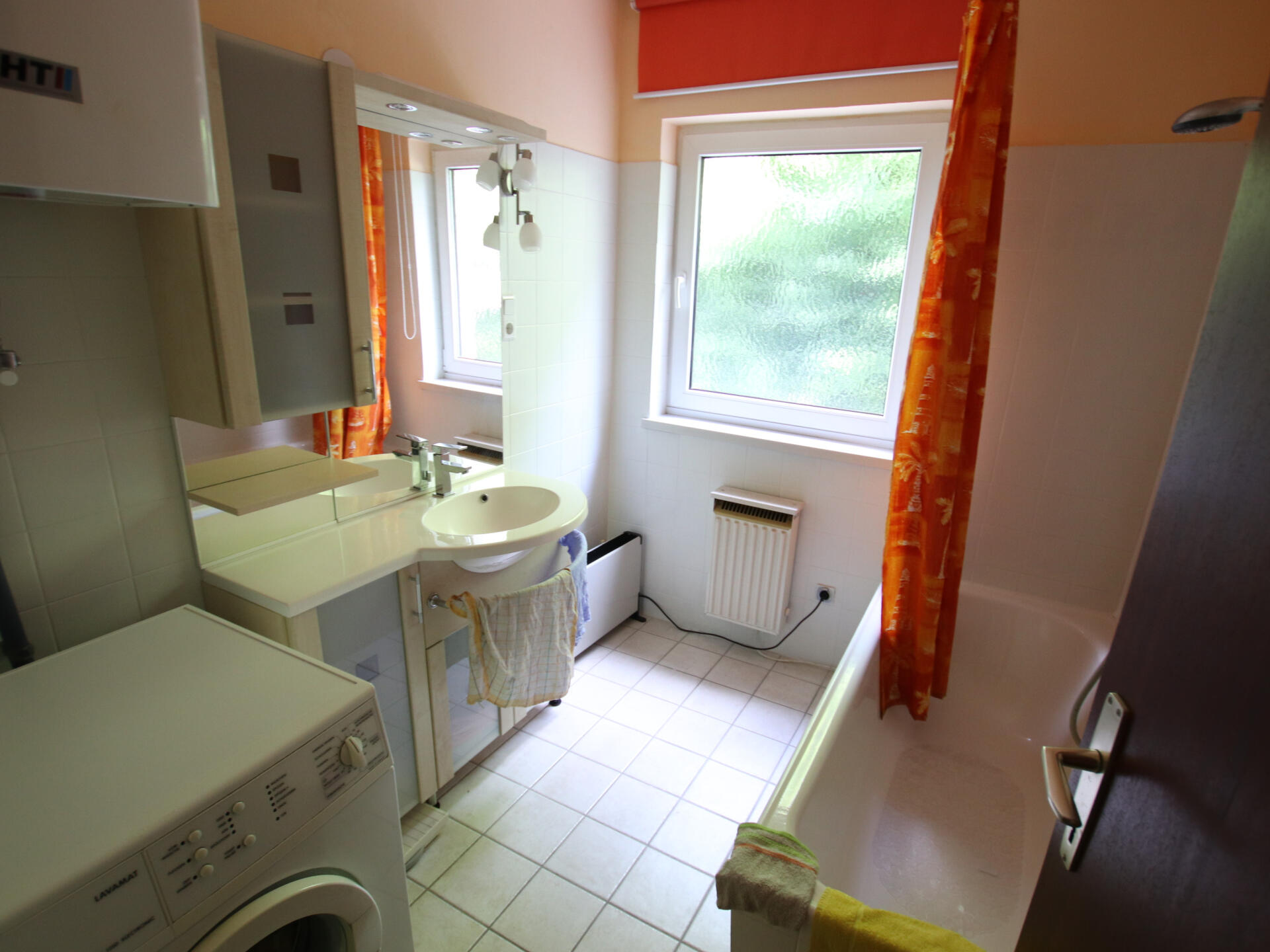 Bad mit Badewanne und Fenster.
