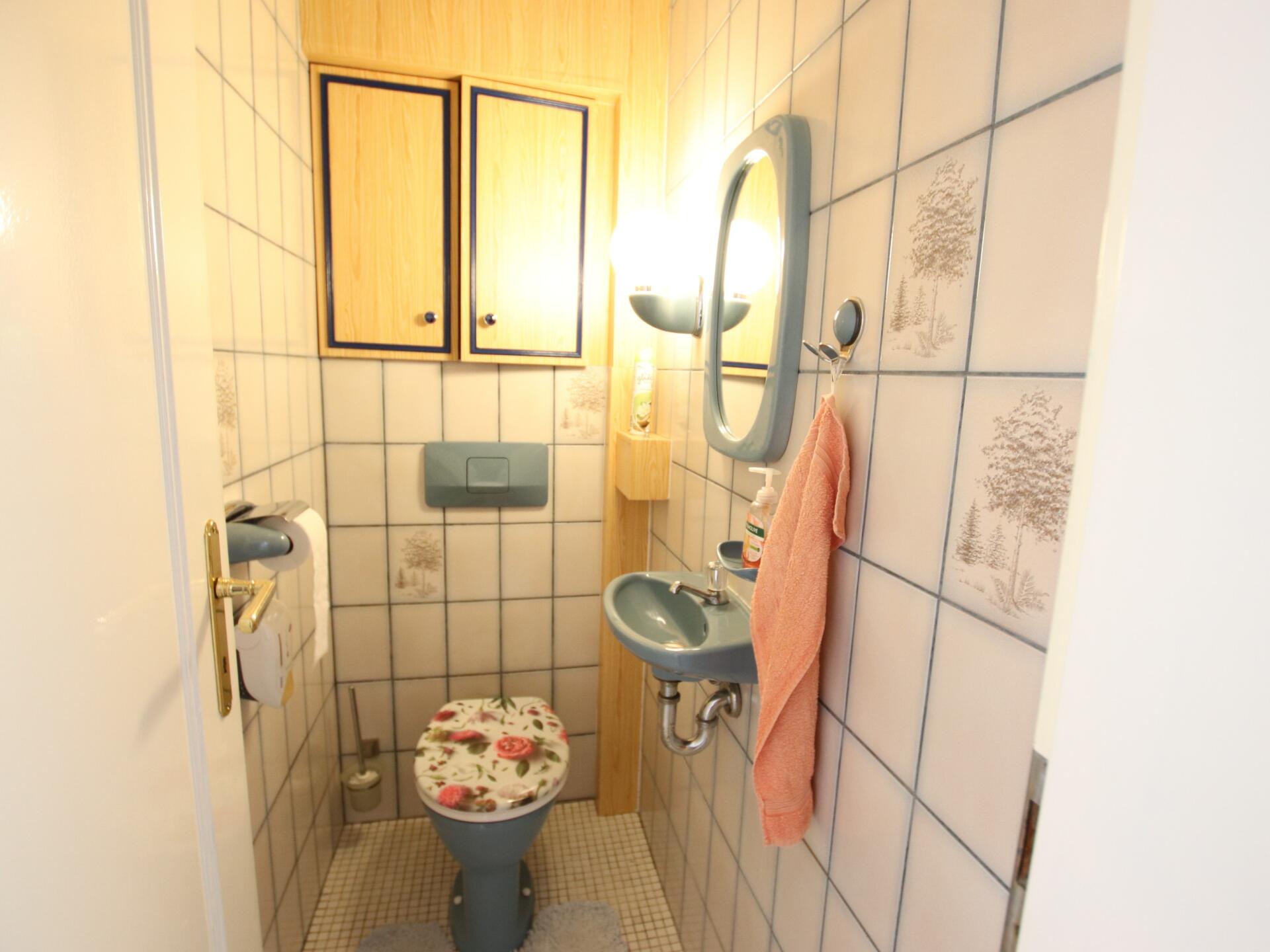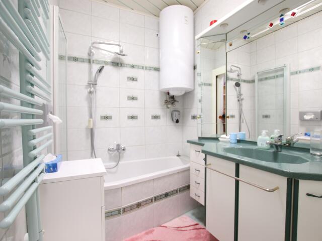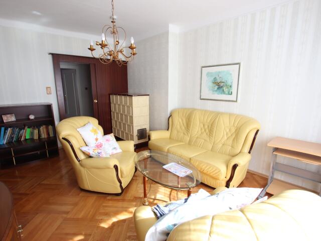Wasserführende Elektro-Etagenheizung mit Heizkörper und Warmwasser mittels Stromboiler und ein Kachelofen im Wohnzimmer.