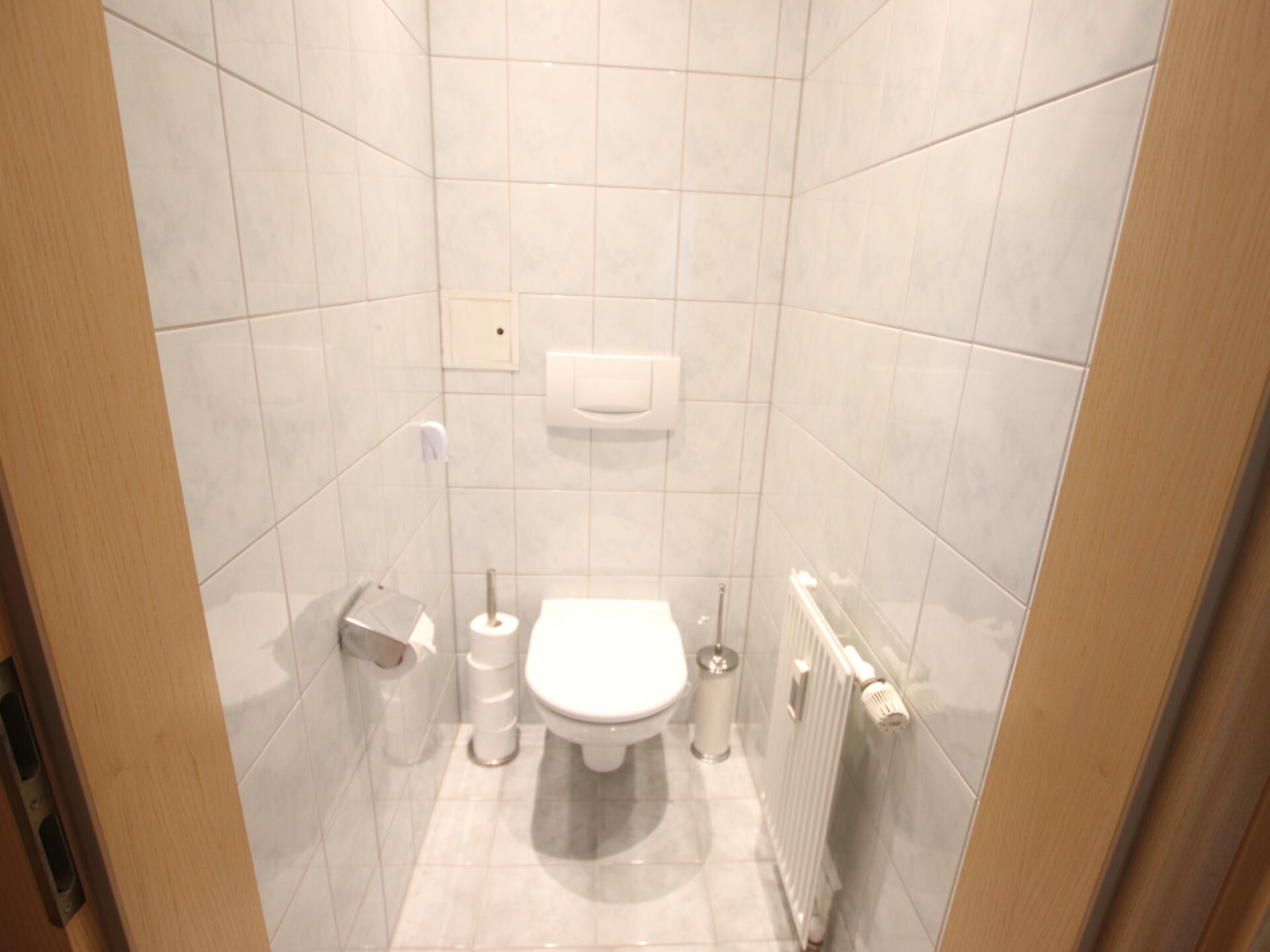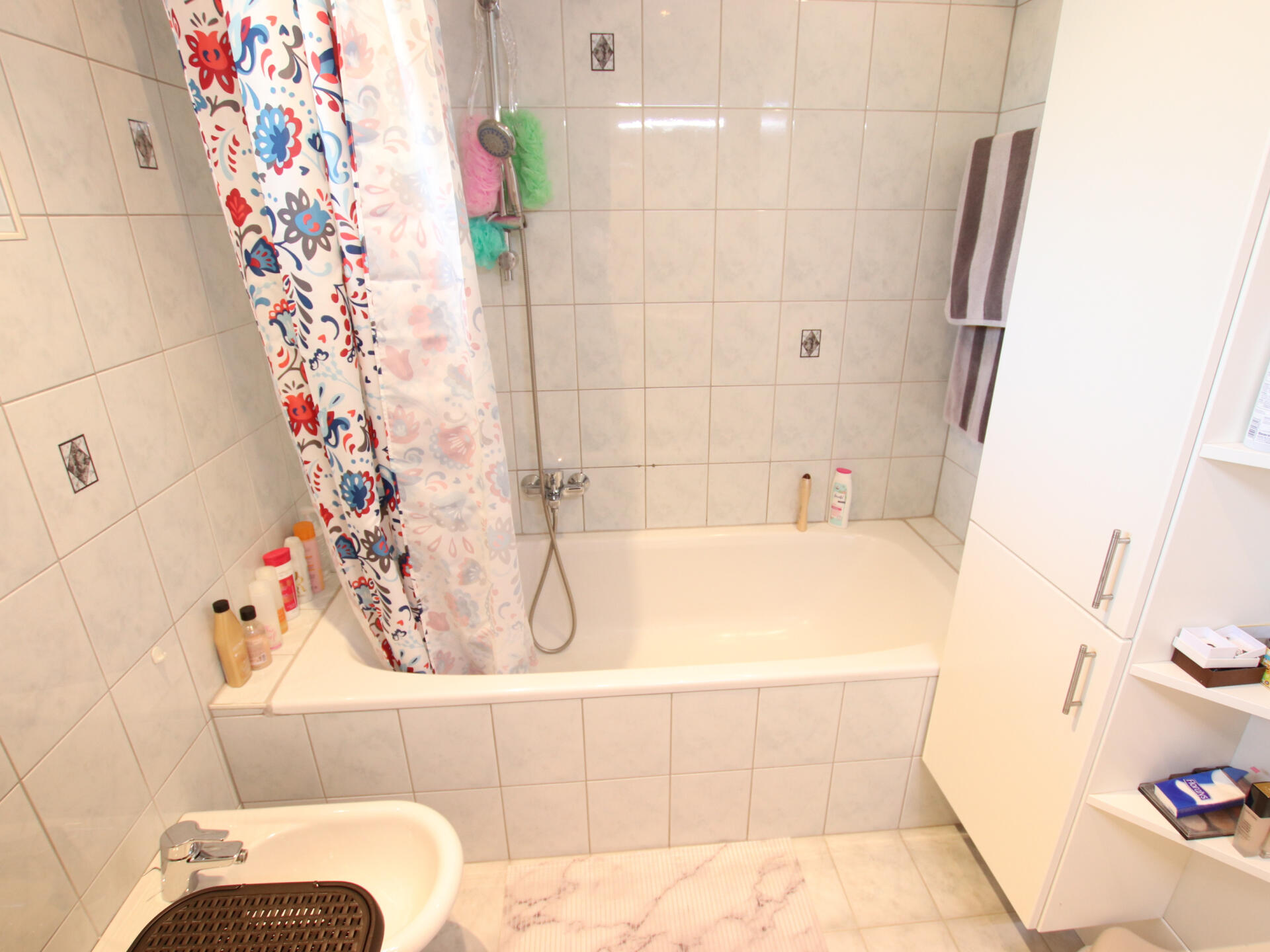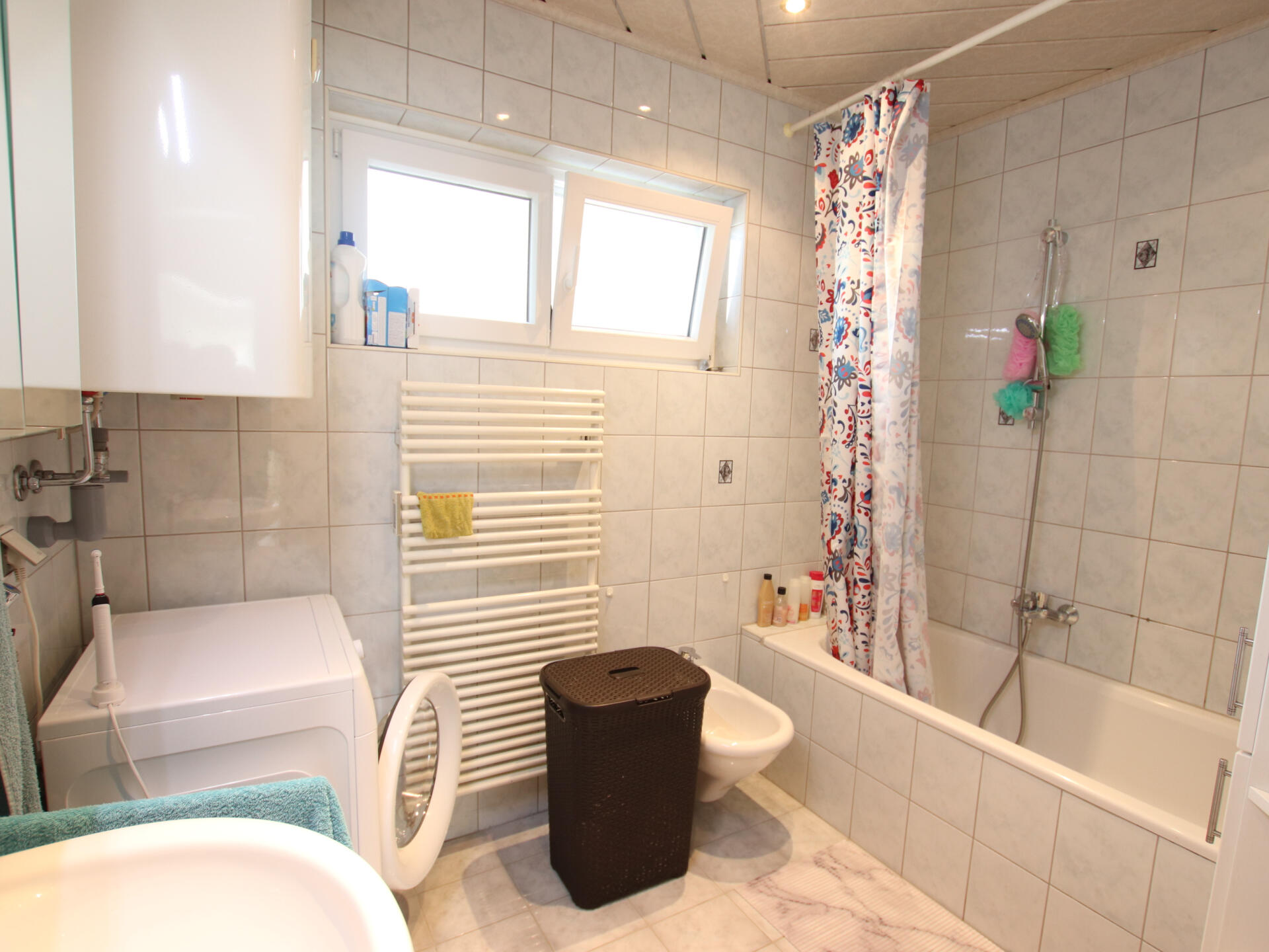 Bad mit Badewanne und Fenster und getrennte Toilette.