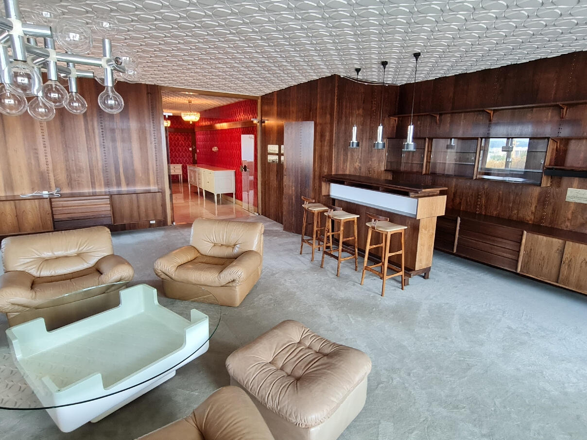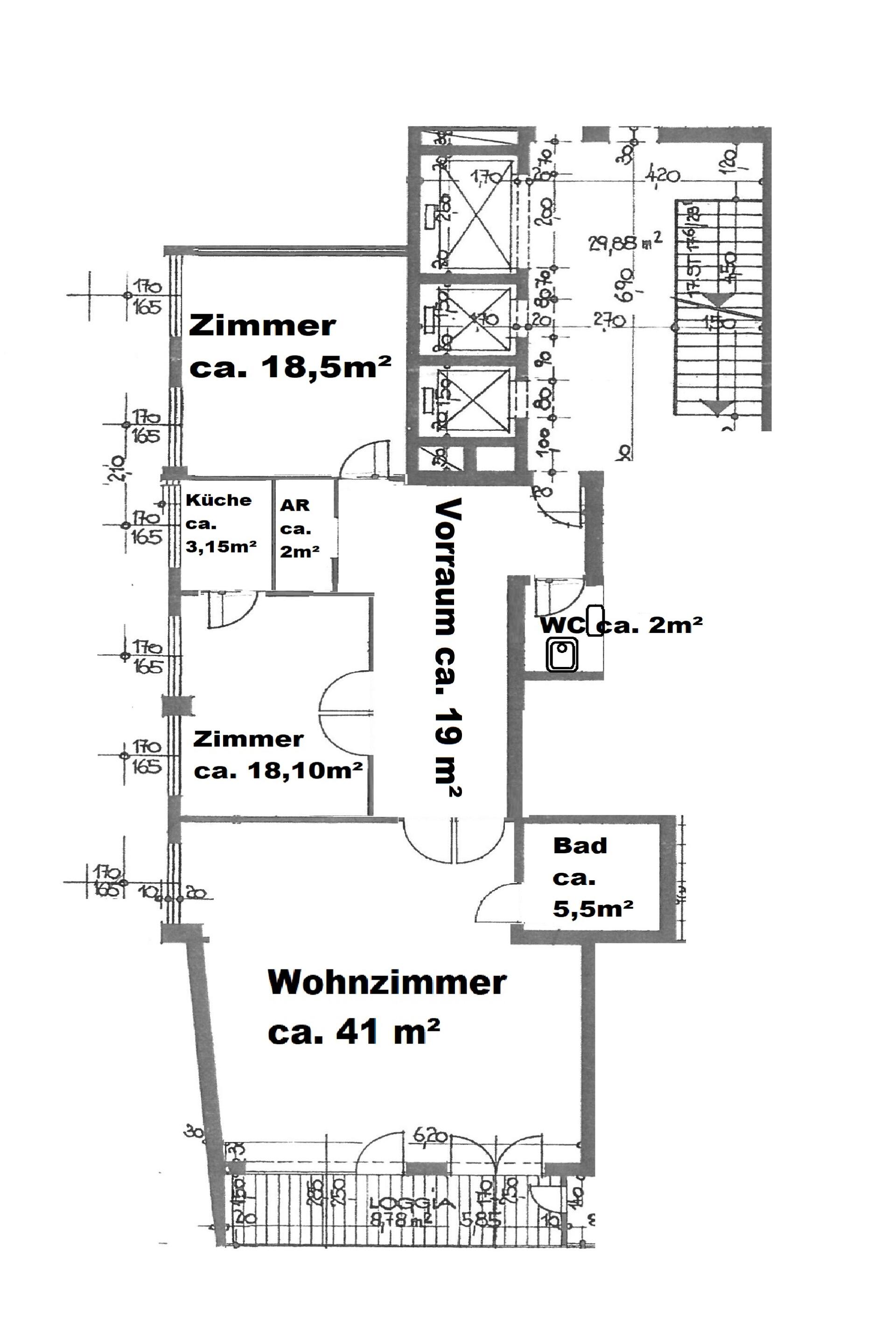 1 großer Vorraum ca. 19 m², 1 großes Wohnzimmer mit 41 m² und Westloggia ca. 9 m², 1 Küche ca. 3,15 m² , 1 Zimmer ca. 18,10 m², 1 Schlafzimmer ca. 18,5 m², Badezimmer mit Badewanne und Bidet ca. 5,5 m², 1 WC extra, 1 Kellerabteil.