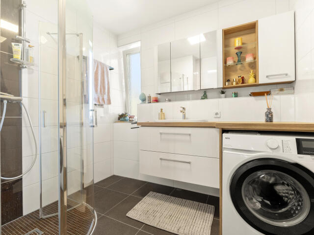 neues Bad mit barrierefreier Dusche (Fußbodenheizung im Bad), Handtuchtrockner, Waschmaschinenanschluss und Fenster.