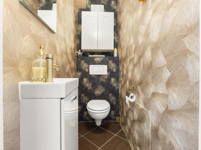 neue Küche mit Geräten, neues Bad mit Badzimmermöbeln, Schiebeeinbaukasten im Vorraum, Essecke (Eckbank) mit Tisch und Stühlen.